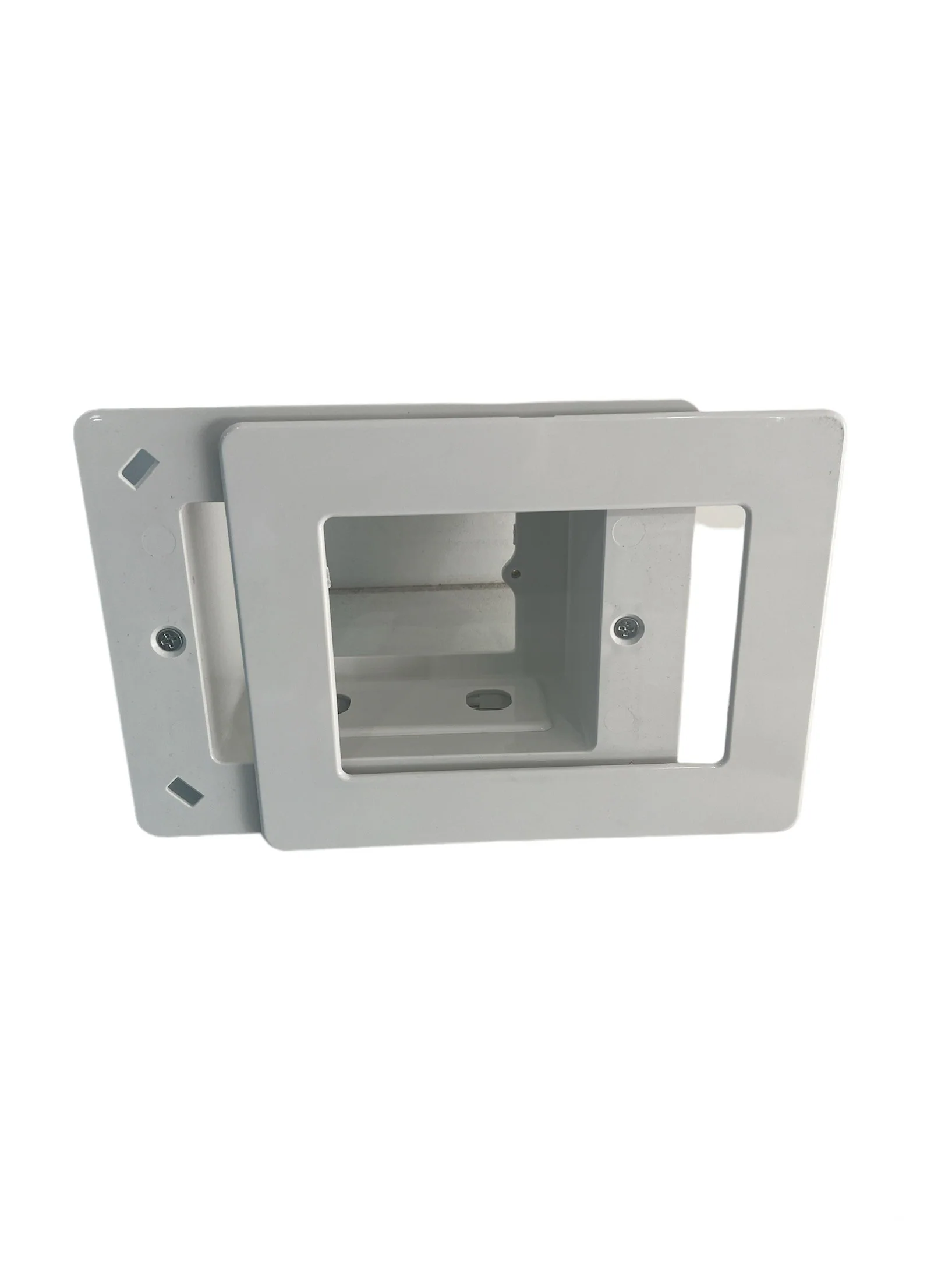 This recessed wall PowerPoint box is a useful plate for a variety of applications. There are 2 holes for mechanical inserts. It can be installed behind TV screens, AV system components, cabinets, desks, tables, fridges, and microwaves.
